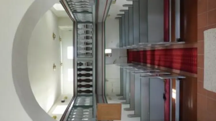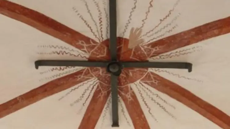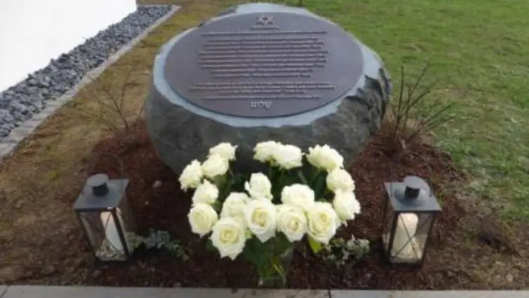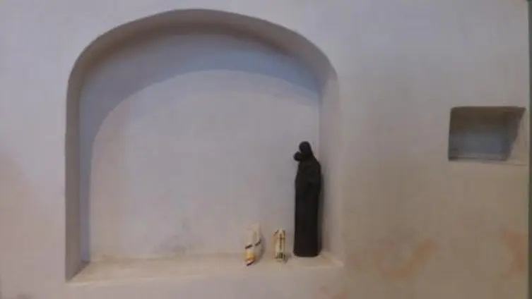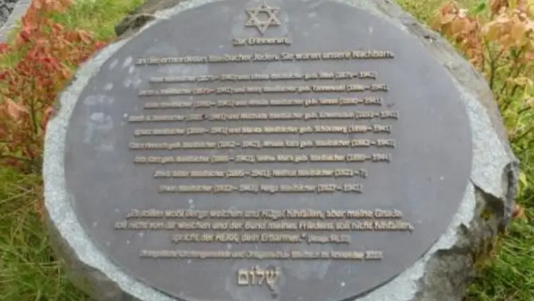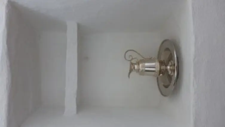 Links vor dem Chorraum befindet sich ein Relief aus Keramik, das eine Lilie als Symbol für Maria vor einem aufgeschlagenen Buch, die Verheißungen des Propheten, darstellt. Auf den Seiten ist der Beginn des Magnifikats, des Lobgesangs der Maria zu lesen: